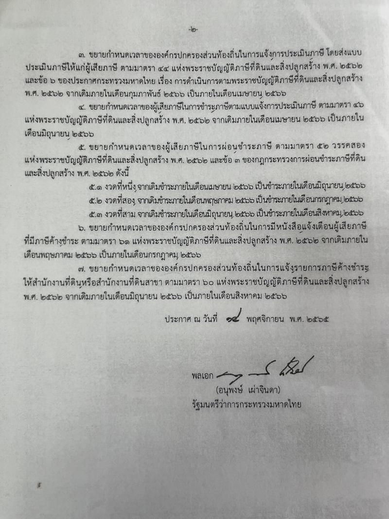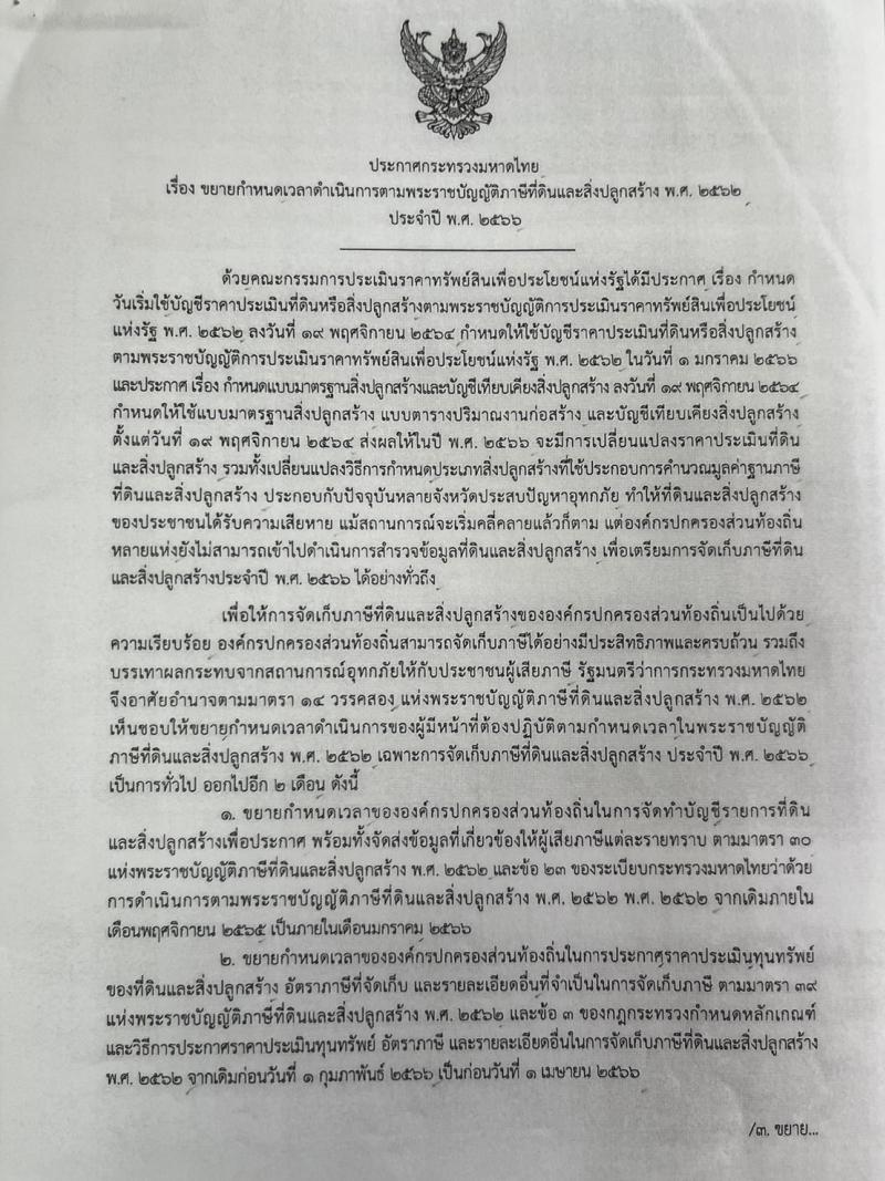 ประกาศการขยายกำหนดเวลาดำเนินการตามพระราชบัญญัติภาษีที่ดินและสิ่งปลูกสร้าง พ.ศ.2562 ประจำปี พ.ศ.2566